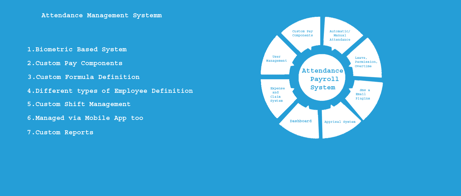 Biometric based attendance and manual based attendance integrated with attendance and leave management system. This will automatically calculate employees Leaves, Permissions, Overtime detail exactly. Based on customer settings it will calculate salary for employee.